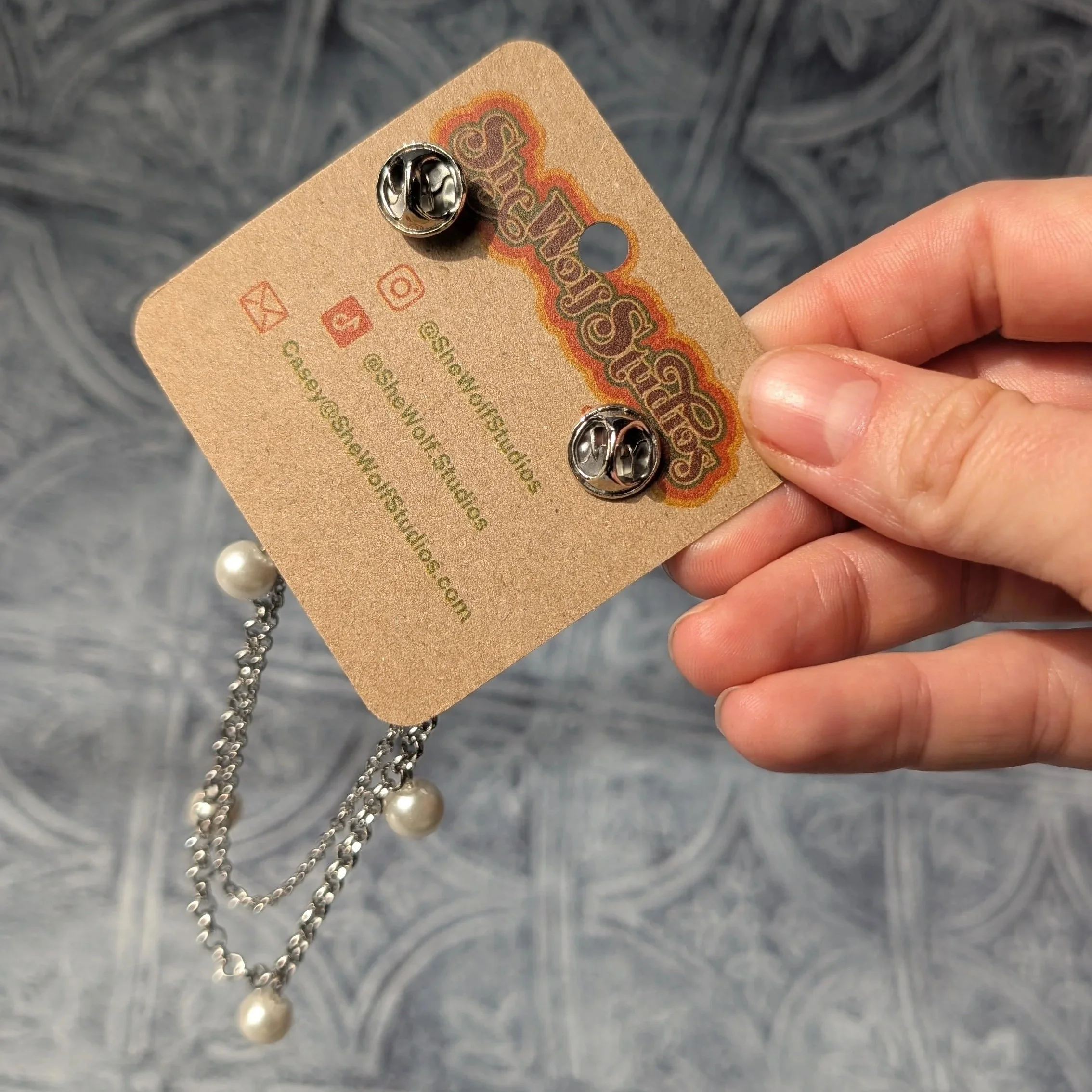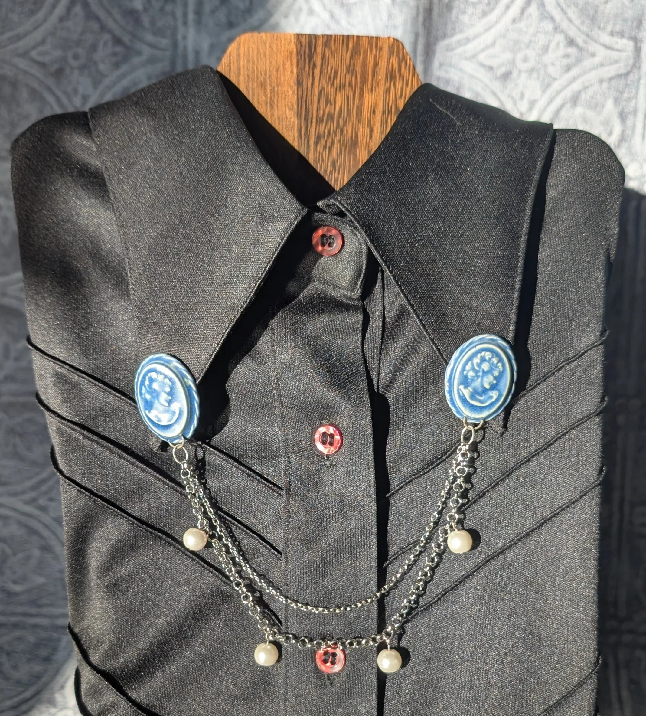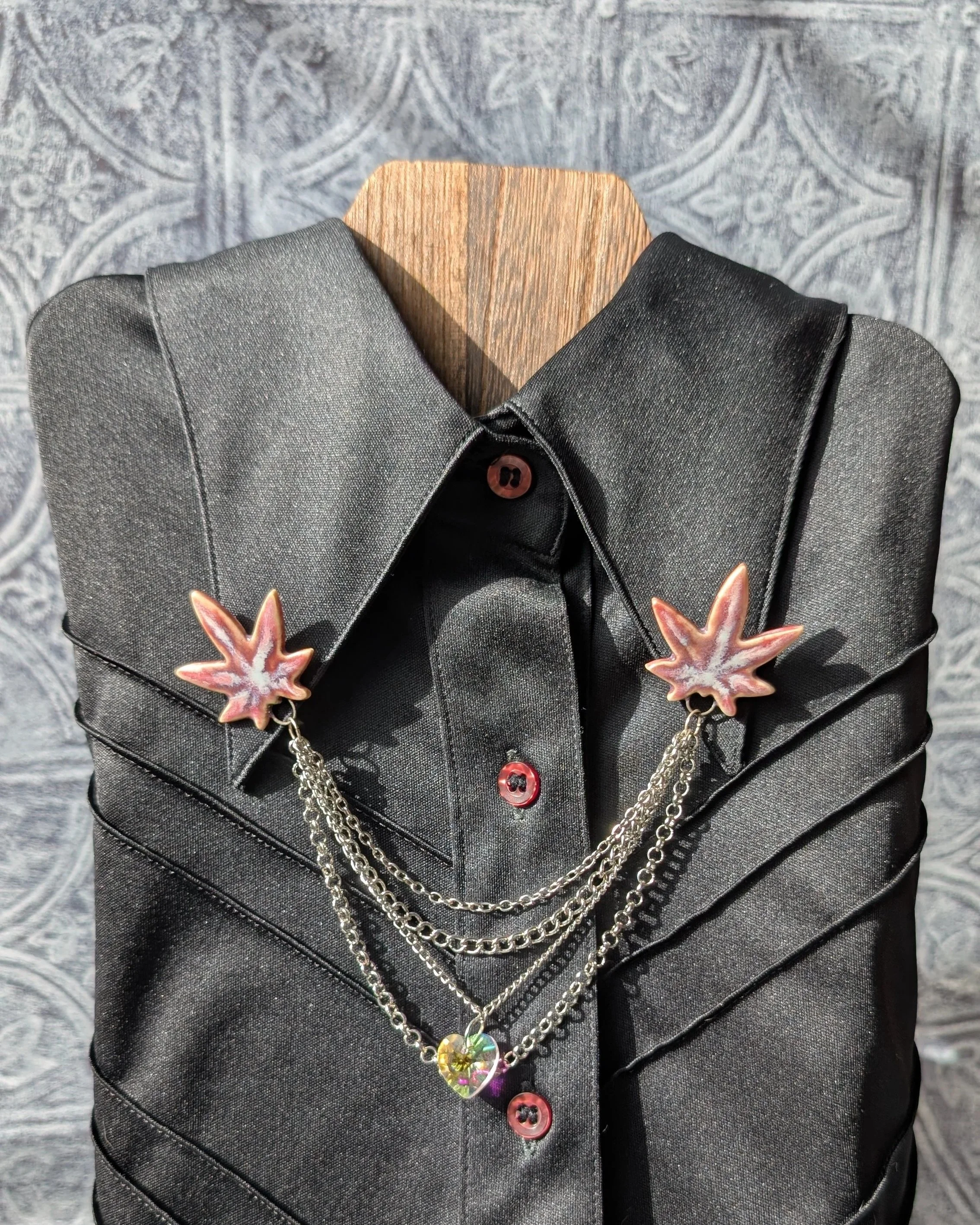 These pins are made to be worn with a collared shirt, a cardigan, or even a cape. I love the idea of taking a formal accessory and adding some funky flare to it. These attach with a pin on the back of each charm.