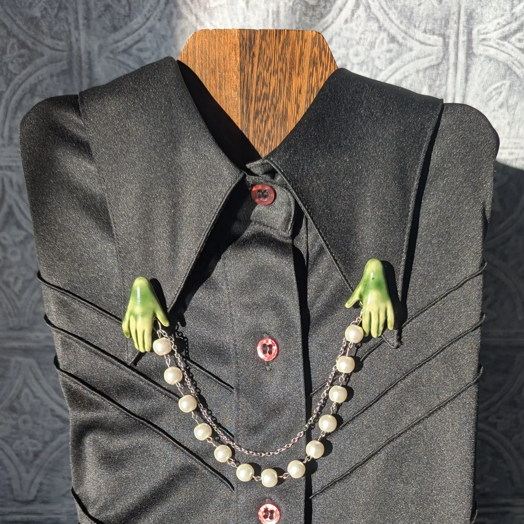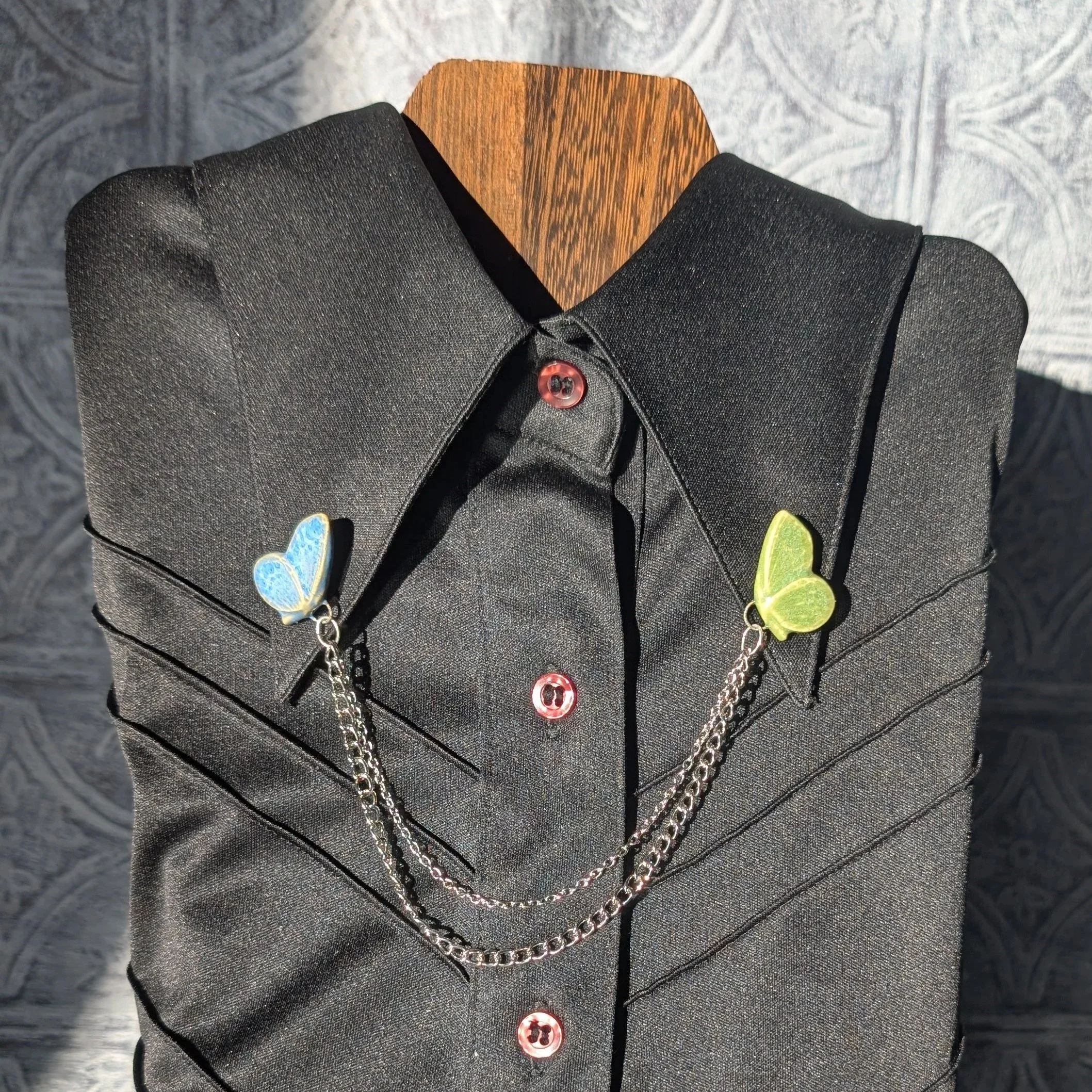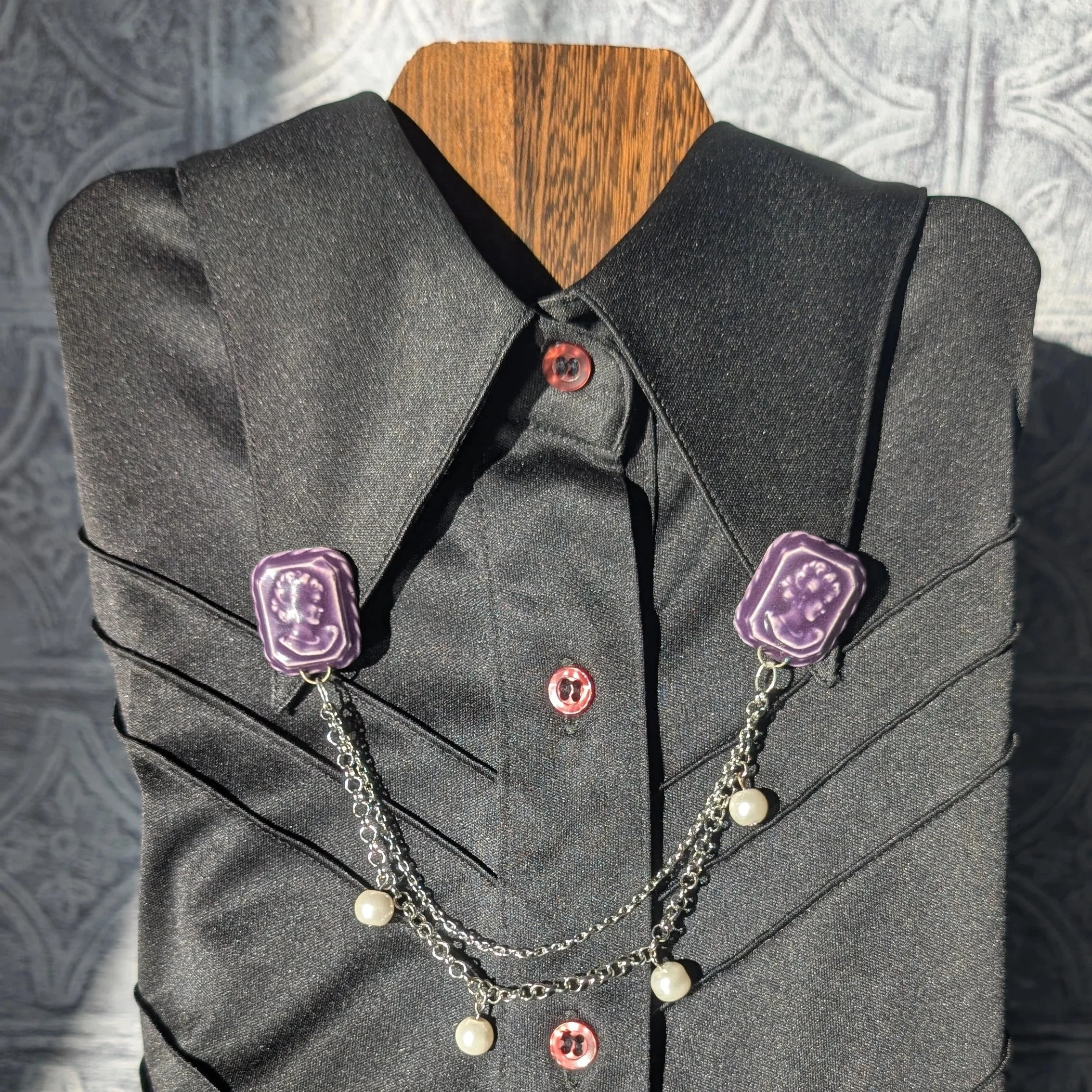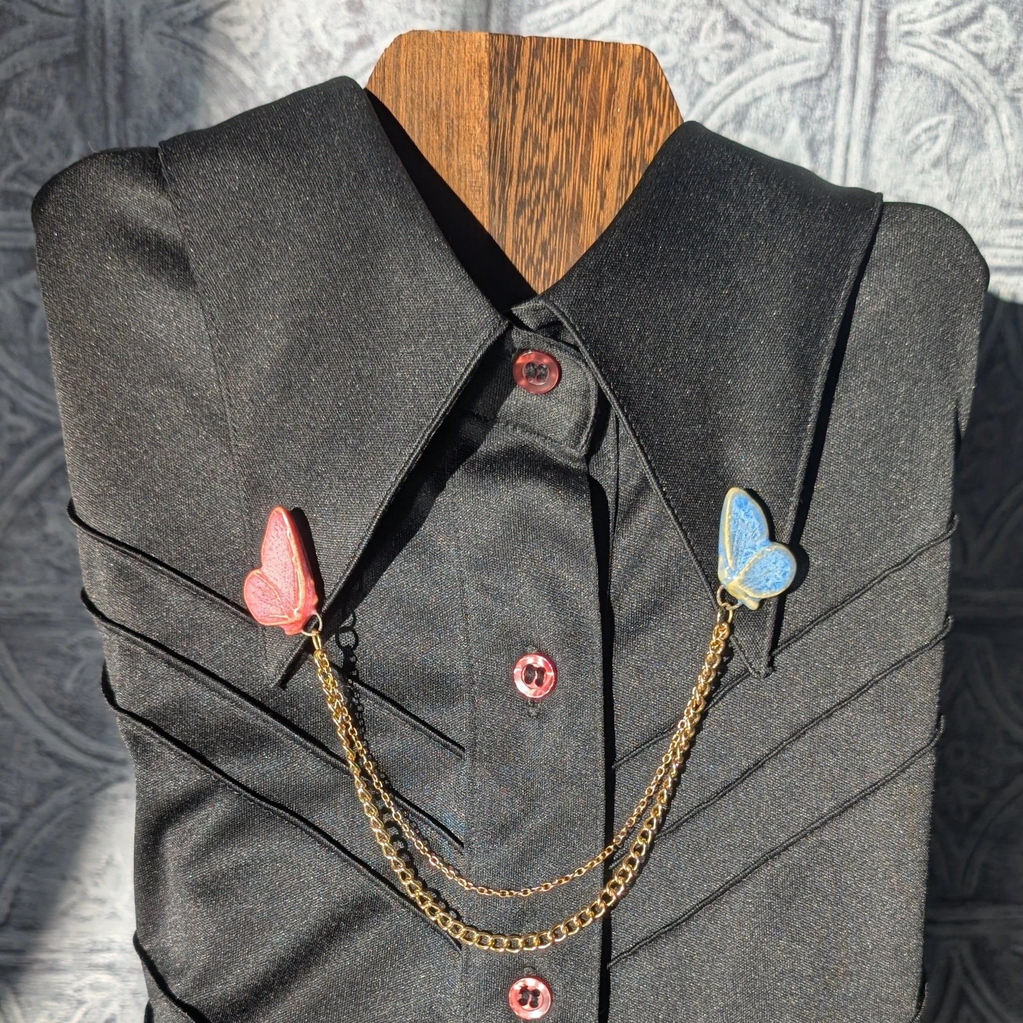 These pins are made to be worn with a collared shirt, a cardigan, or even a cape. I love the idea of taking a formal accessory and adding some funky flare to it. These attach with a pin on the back of each charm.